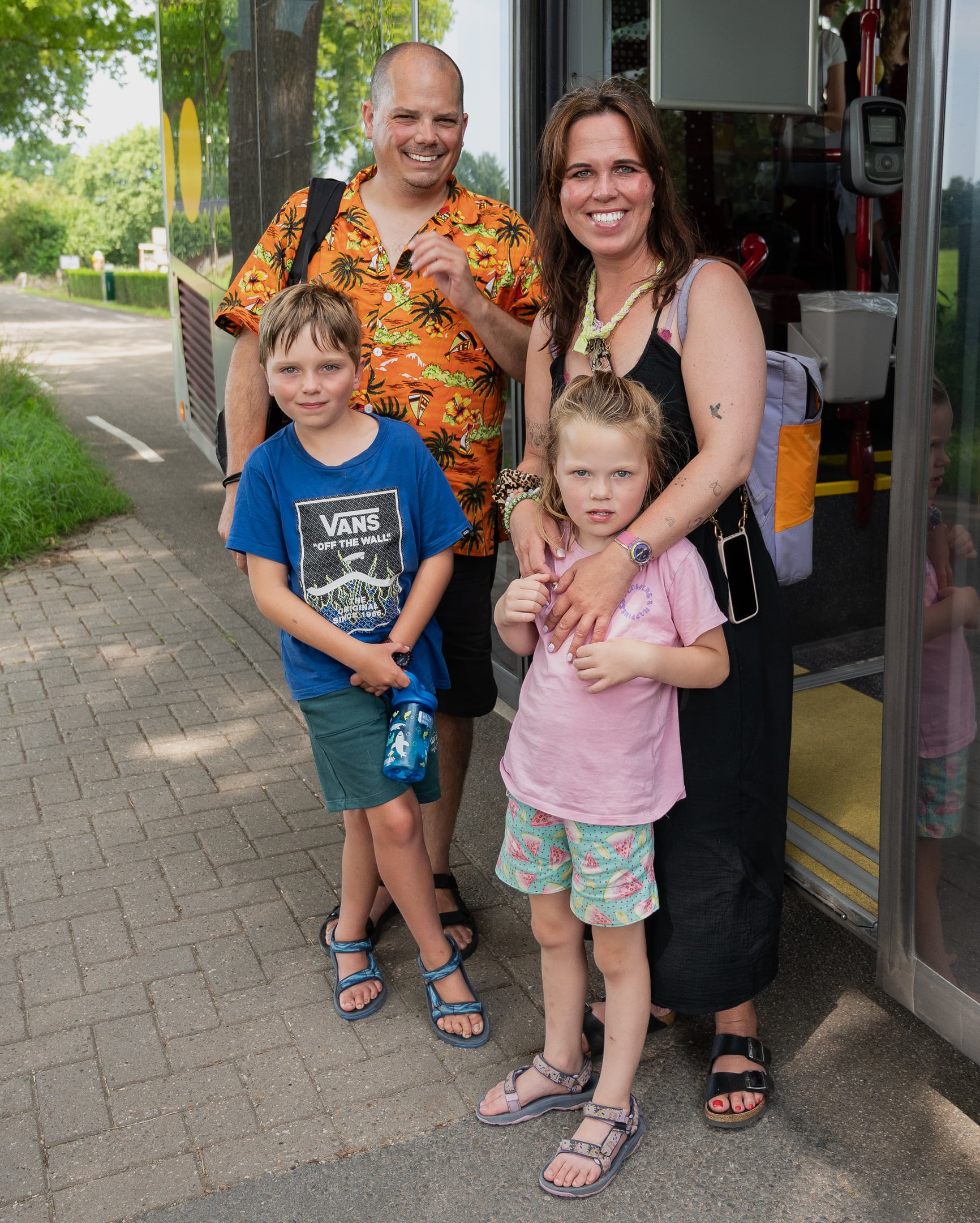 Zodra we instapten, renden de kinderen meteen naar het achterste gedeelte van de bus, waar de banken wat hoger stonden. Zo hadden ze goed uitzicht en genoten ze volop van de rit. Willem zat naast Jaco, Sofie naast mij; zo konden we onderweg in alle rust samen praten over wat we zagen. Omdat we zelf niet hoefden te rijden, konden we echt ontspannen en ons volledig richten op elkaar en de groene omgeving.