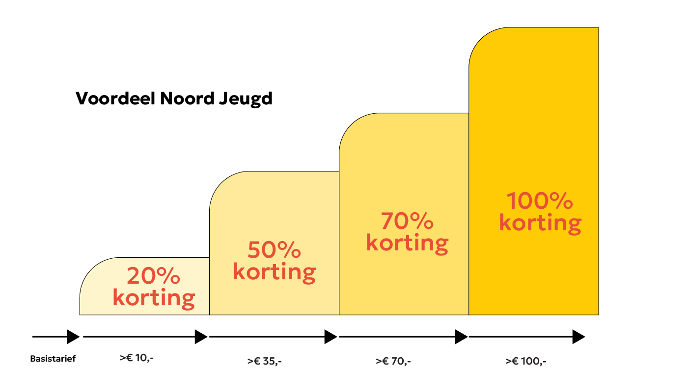 - Voordeel Noord Jeugd (4 t/m 18 jaar): geldig in bus en trein. Bekijk de korting hier.